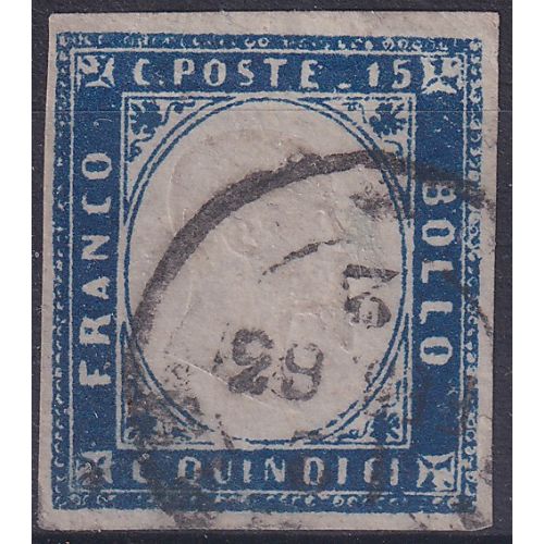Tipo di Sardegna non dentellatoEmesso il 1 gennaio 186315 c. - Effigie di Vittorio Emanuele II in rilievo entro un ovale