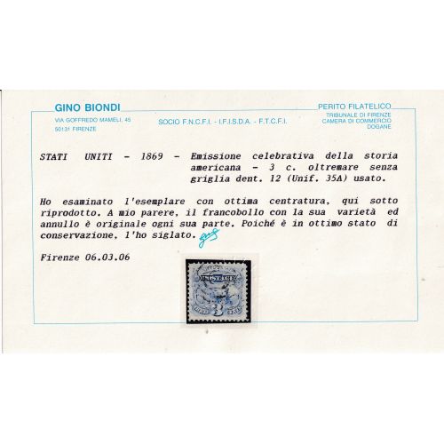 1869 Emissione celebrativa della storia Americana 3 c oltremare - Senza griglia 35/A | usato con certificato di garanzia