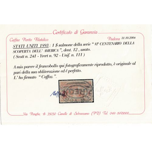 Francobolli Stati Uniti 1893- Esposizione Mondiale Colombiana di Chicago - certificato Caffaz
