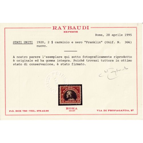 Francobolli Stati Uniti 1920- Effige di B.Franklin ,2$ carminio e nero.Cert. Raybaudi